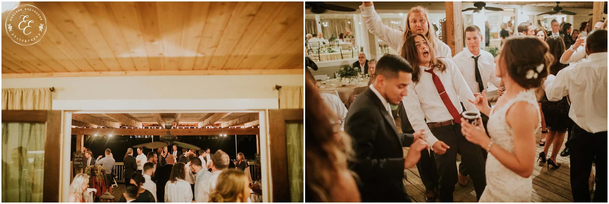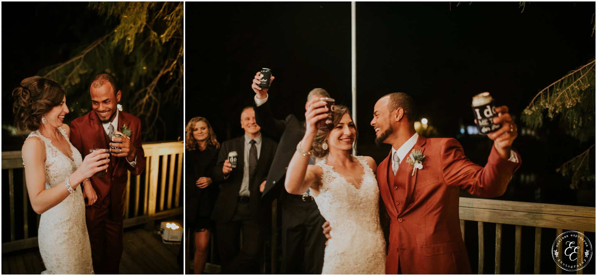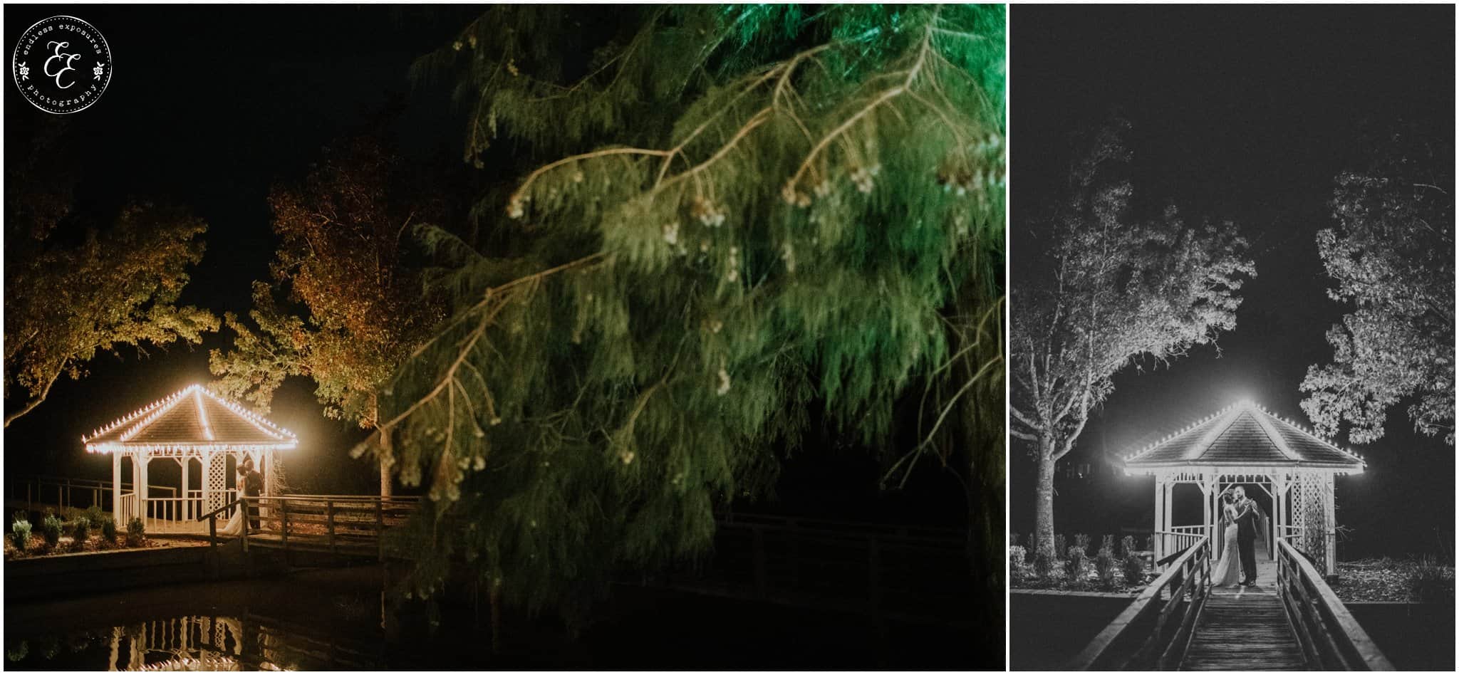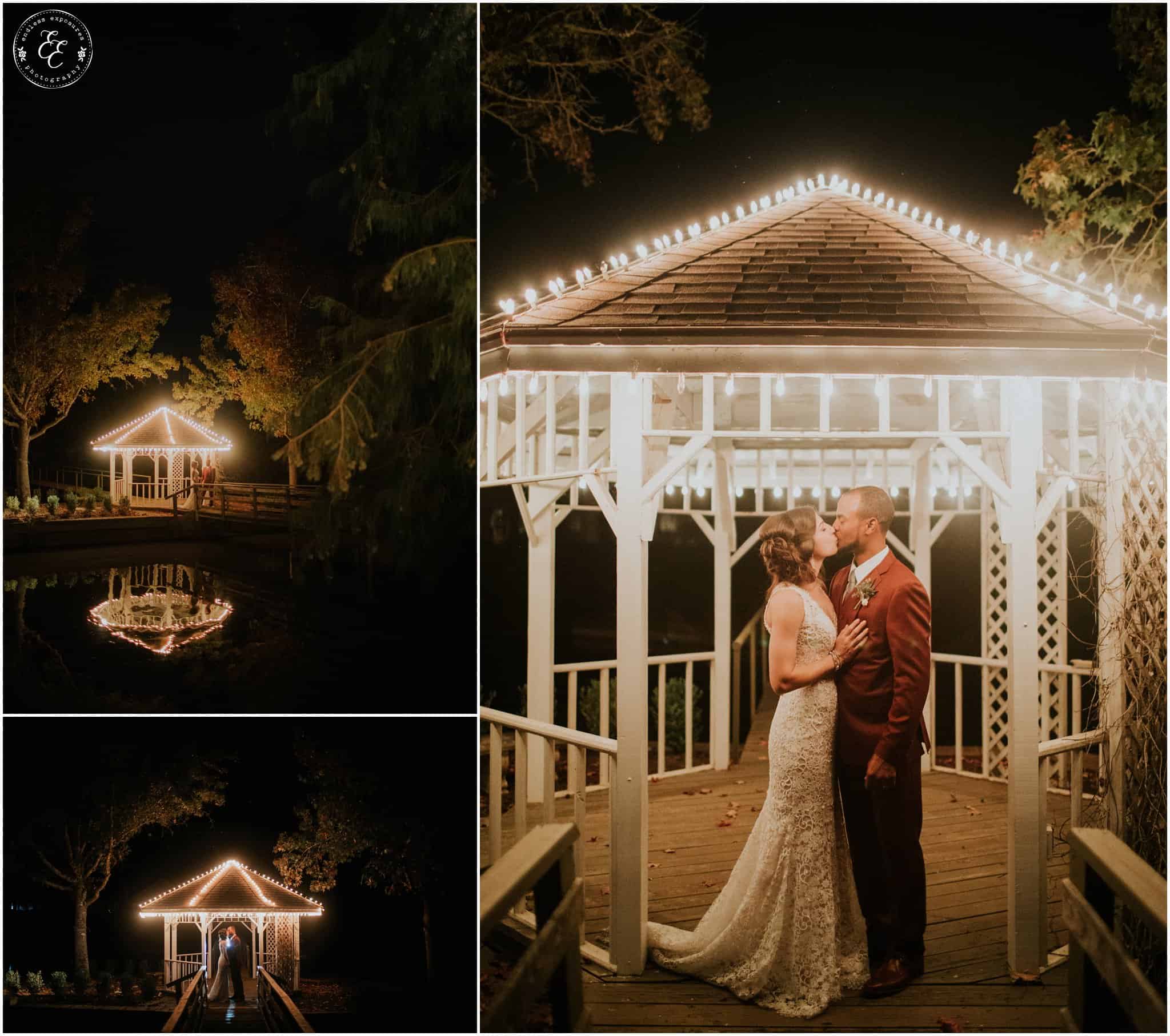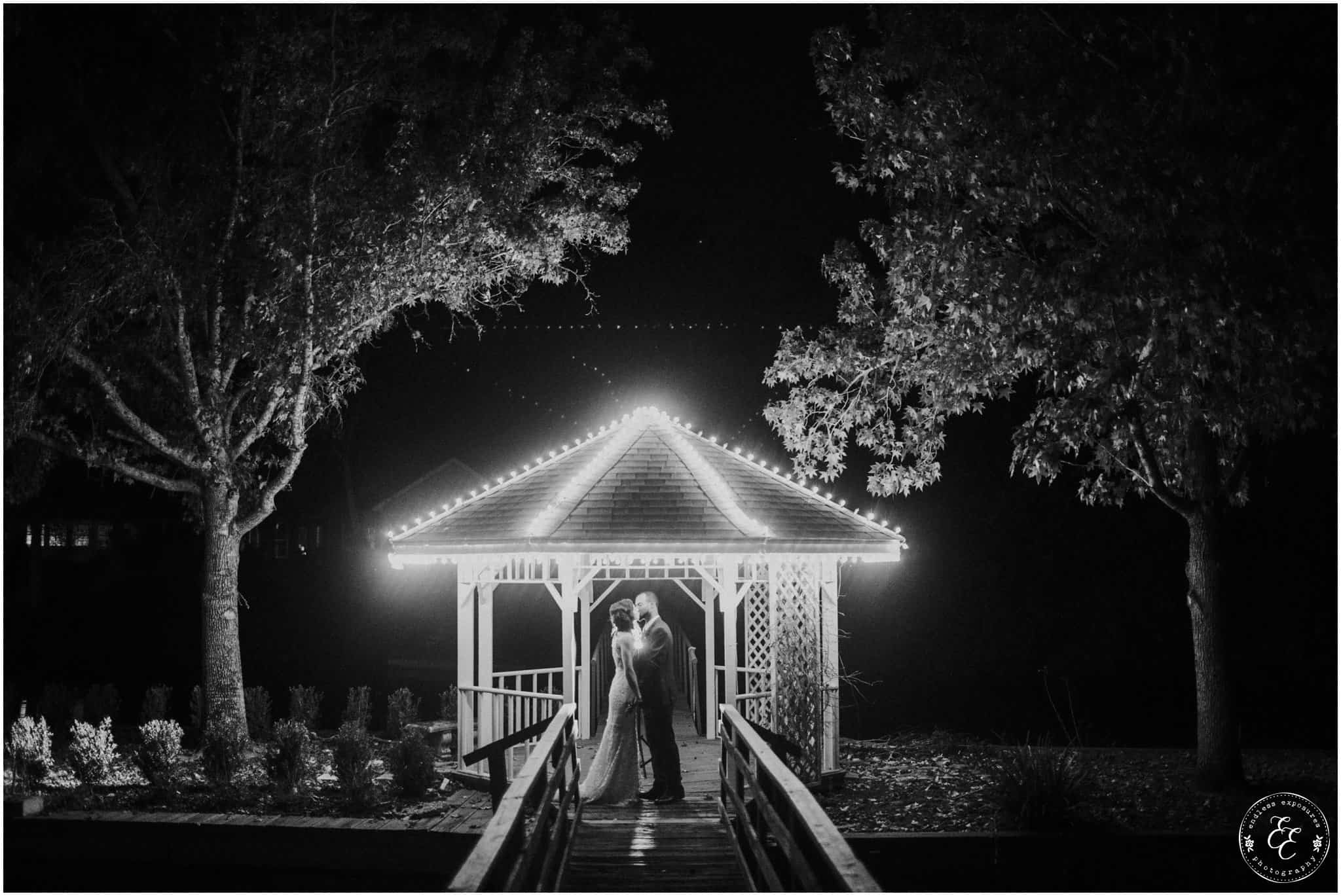 The ladies got ready in one house, while the groomsmen were getting ready in the house across from it (even more bedrooms for people to spend the night there!). So, bride can stay tucked away comfortably and even take photos outside without being noticed by the guys side! It’s so convenient! There was also an outdoor setup/dining area for guests to have dinner and cocktails — with a deck outside where most of the guests like to hang out and enjoy nature under the patio lights and stars. You can take a walk across the bridge to connect to the on-water gazebo for some beautiful night-couple shots. I loved the opportunity to steal Miranda + Paul away during the middle of the reception to get some fun shots down there while guests were just hanging out and enjoying the evening!