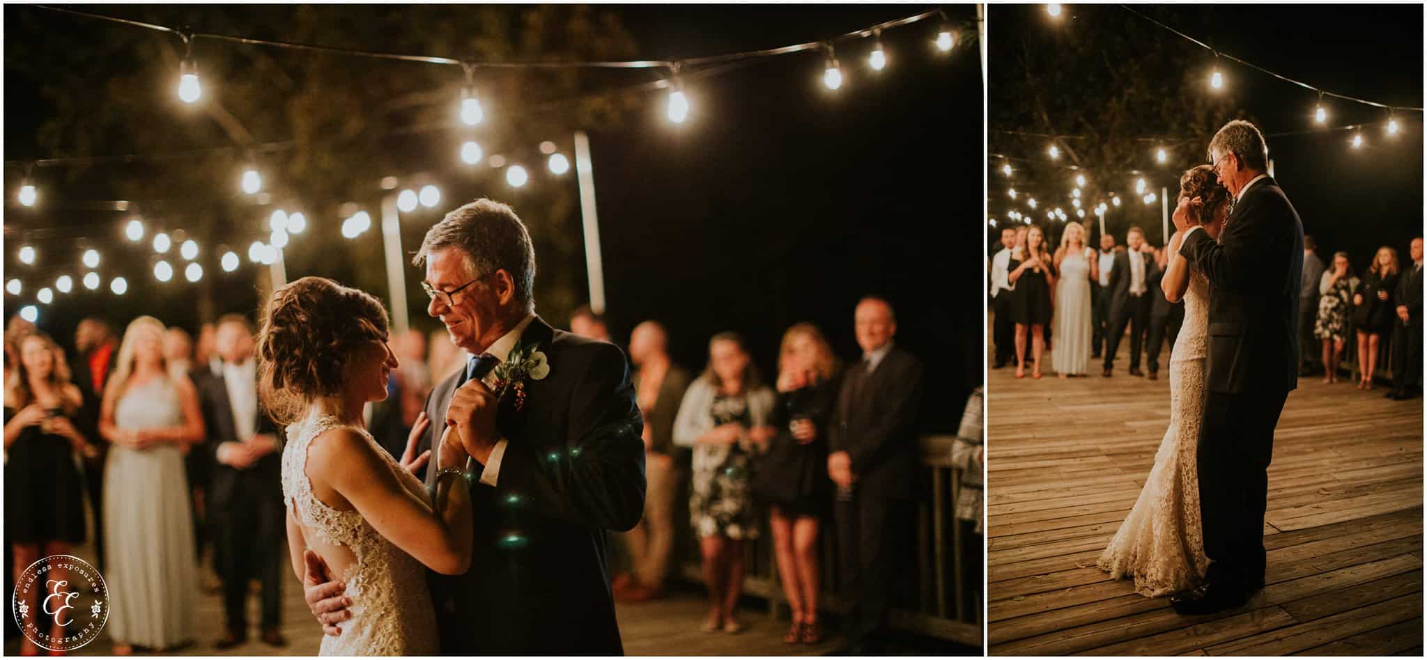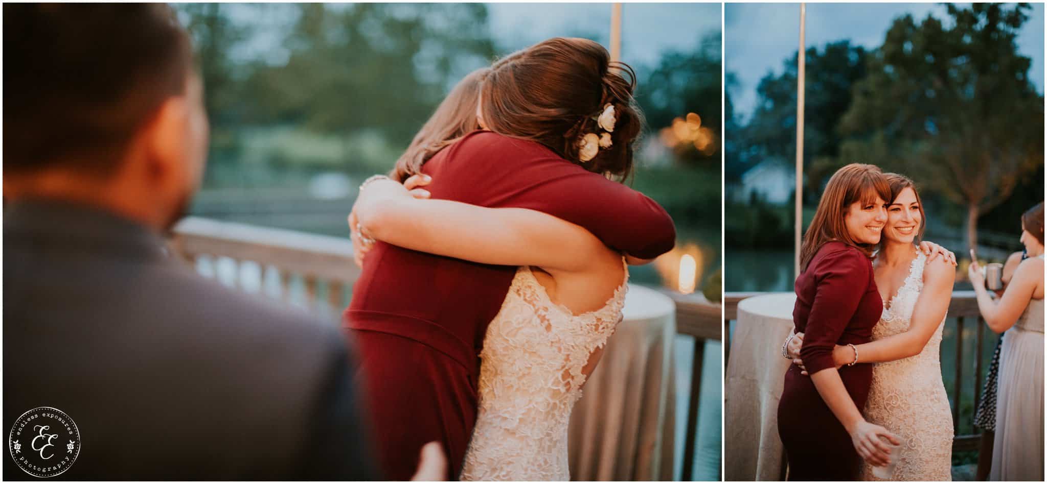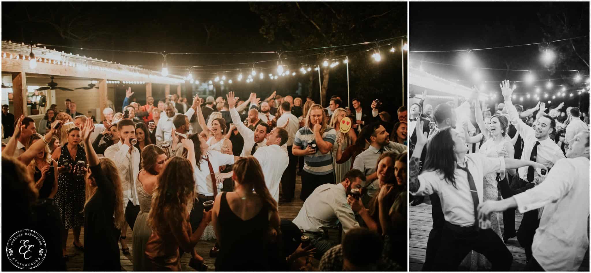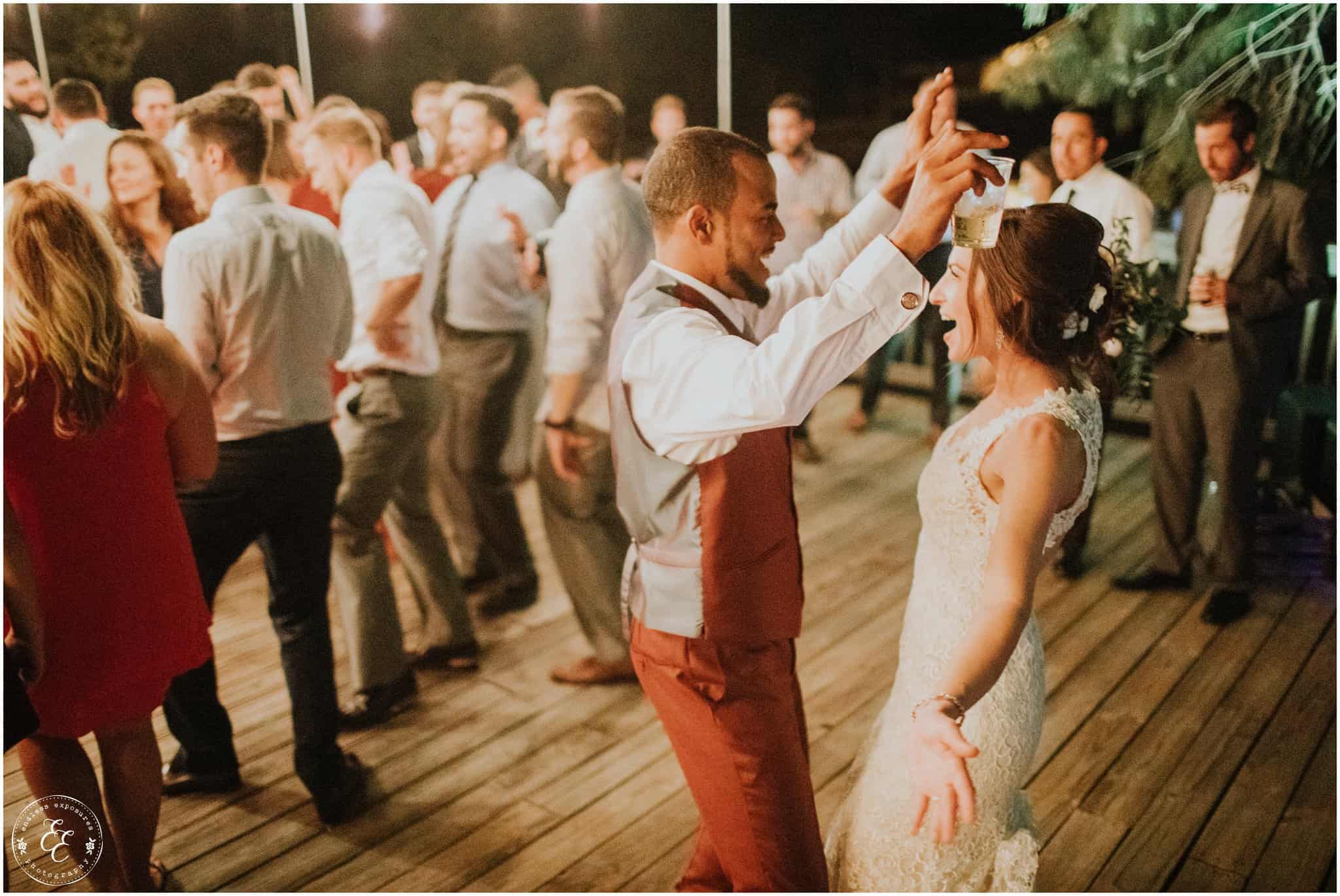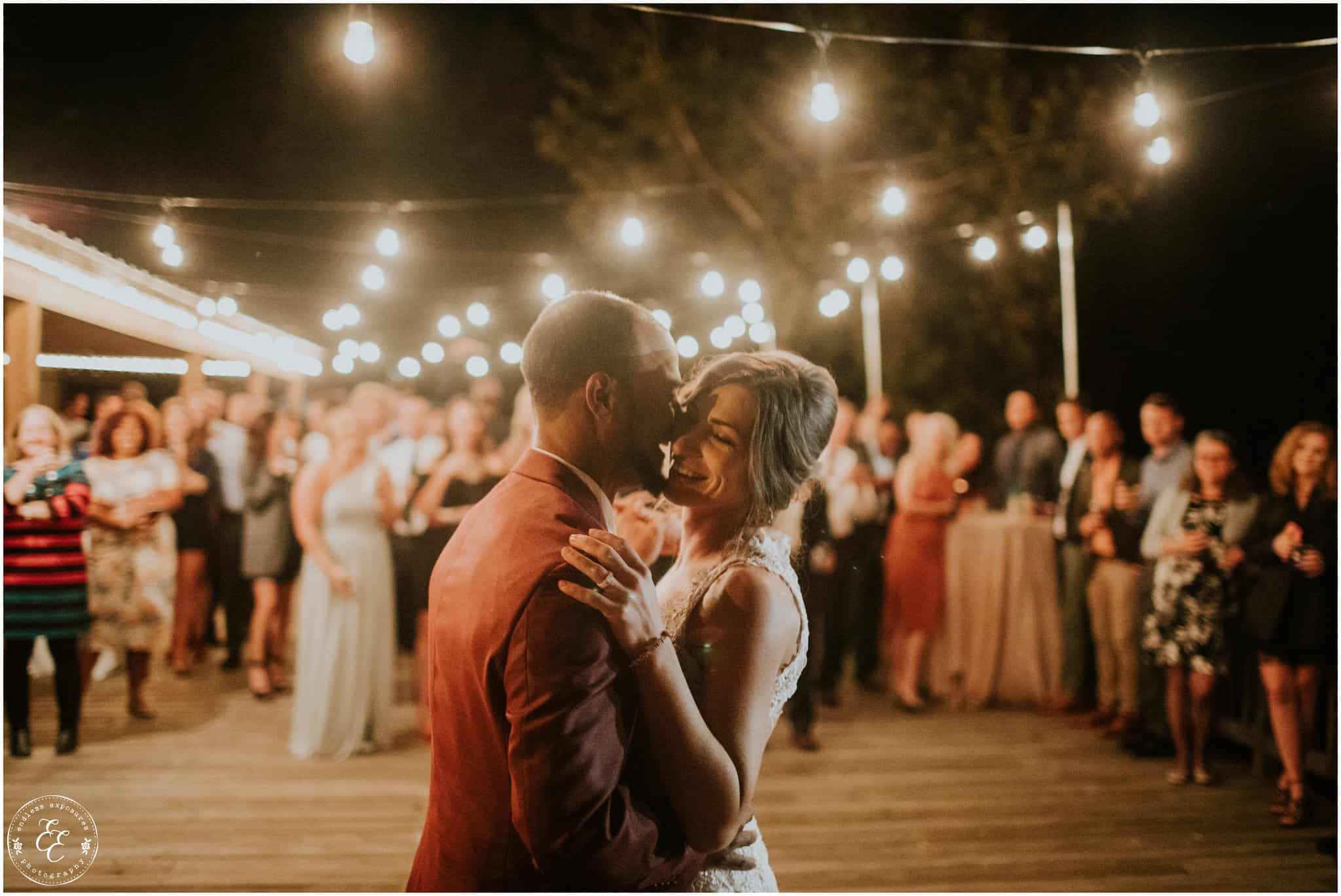 The ladies got ready in one house, while the groomsmen were getting ready in the house across from it (even more bedrooms for people to spend the night there!). So, bride can stay tucked away comfortably and even take photos outside without being noticed by the guys side! It’s so convenient! There was also an outdoor setup/dining area for guests to have dinner and cocktails — with a deck outside where most of the guests like to hang out and enjoy nature under the patio lights and stars. You can take a walk across the bridge to connect to the on-water gazebo for some beautiful night-couple shots. I loved the opportunity to steal Miranda + Paul away during the middle of the reception to get some fun shots down there while guests were just hanging out and enjoying the evening!