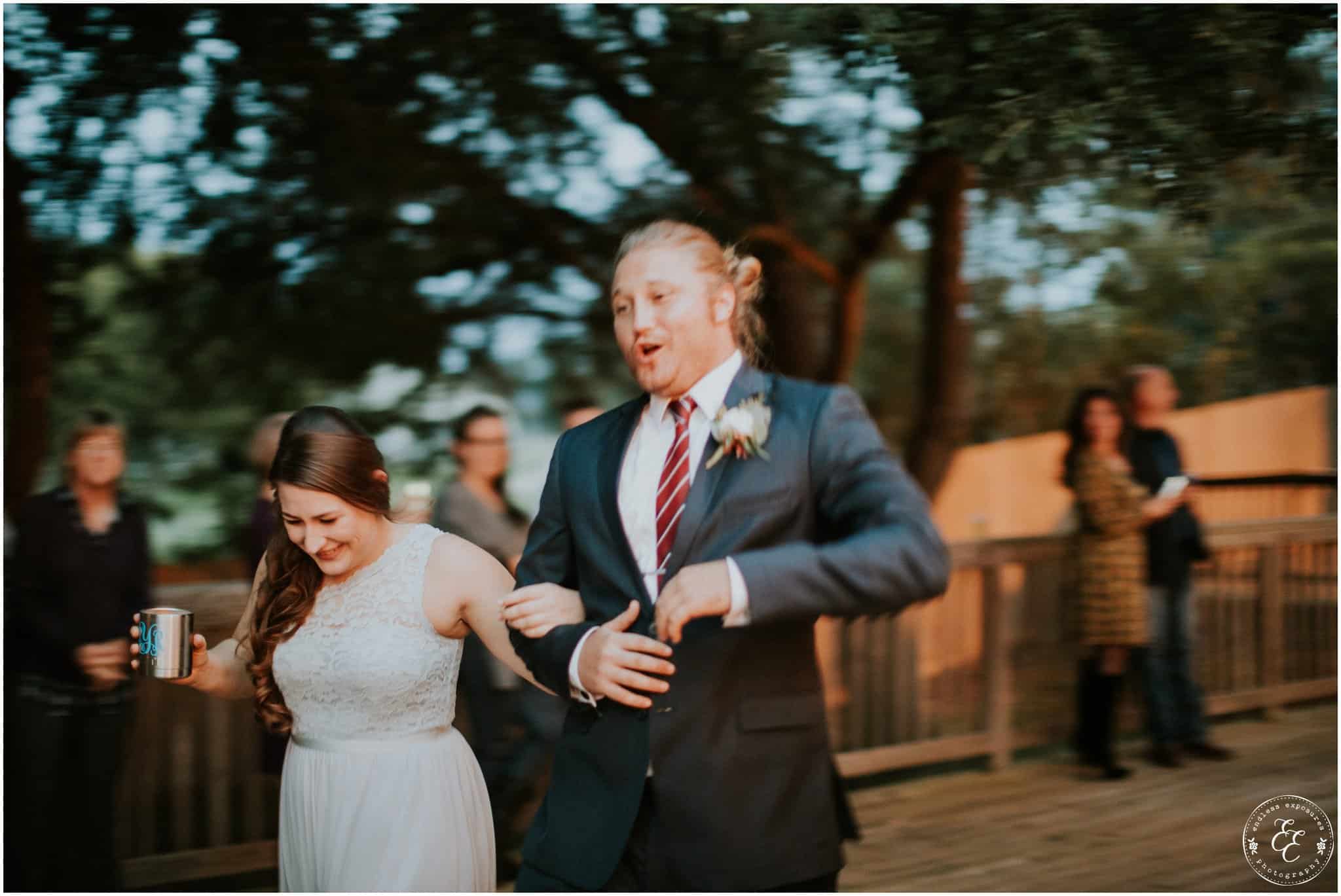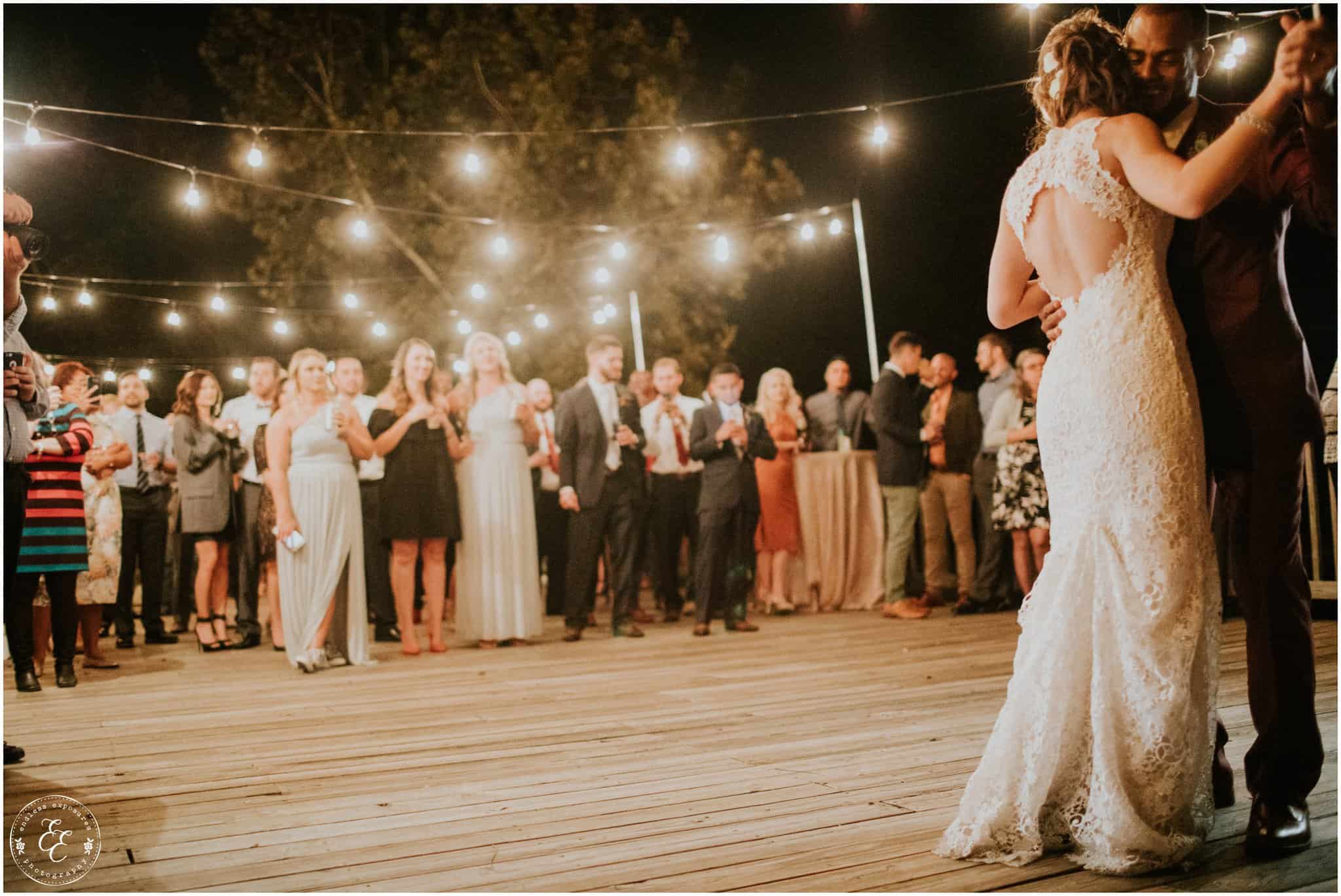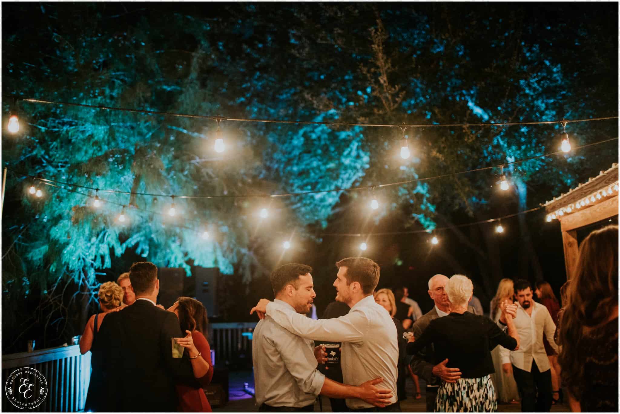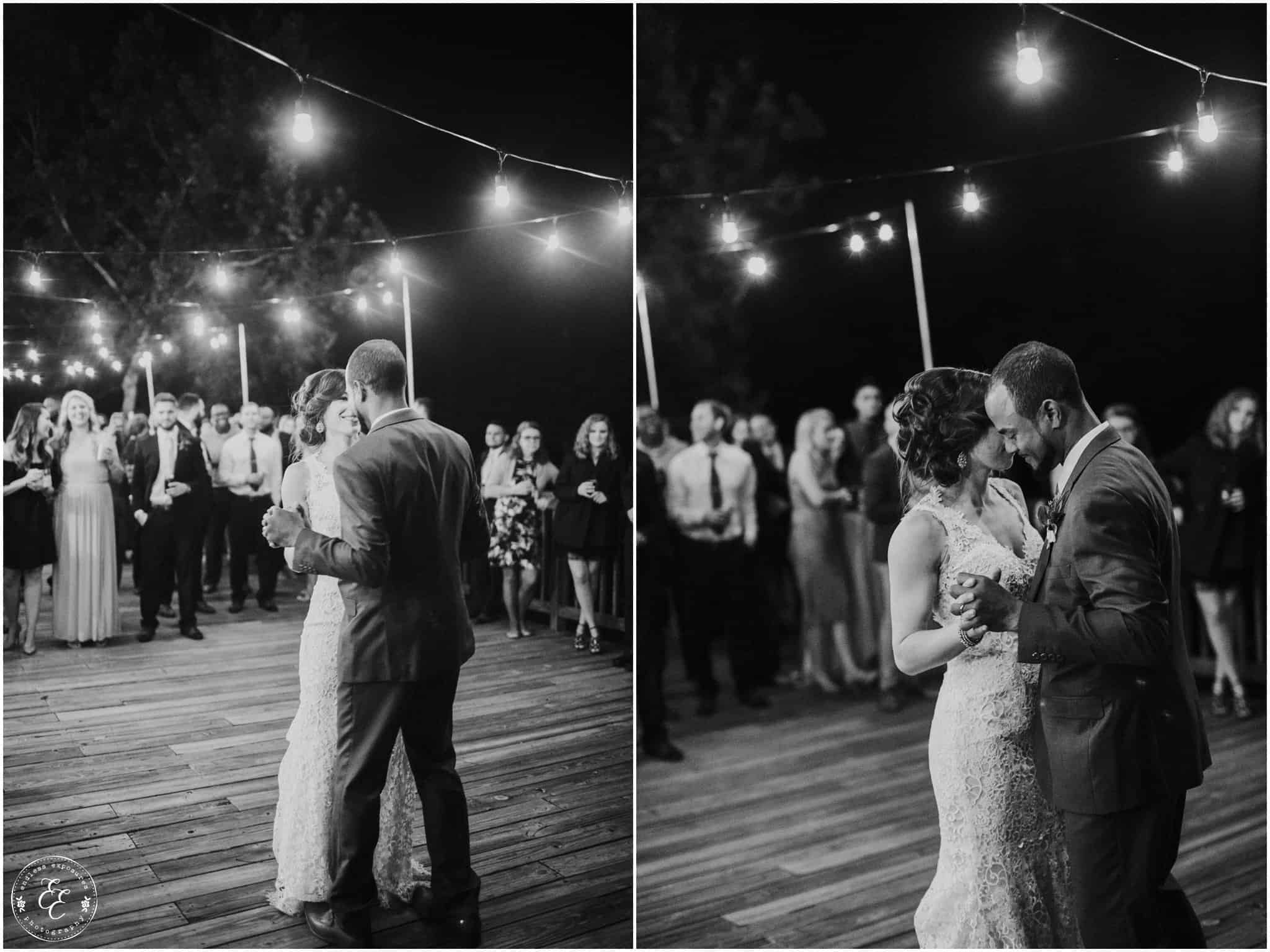 The ladies got ready in one house, while the groomsmen were getting ready in the house across from it (even more bedrooms for people to spend the night there!). So, bride can stay tucked away comfortably and even take photos outside without being noticed by the guys side! It’s so convenient! There was also an outdoor setup/dining area for guests to have dinner and cocktails — with a deck outside where most of the guests like to hang out and enjoy nature under the patio lights and stars. You can take a walk across the bridge to connect to the on-water gazebo for some beautiful night-couple shots. I loved the opportunity to steal Miranda + Paul away during the middle of the reception to get some fun shots down there while guests were just hanging out and enjoying the evening!