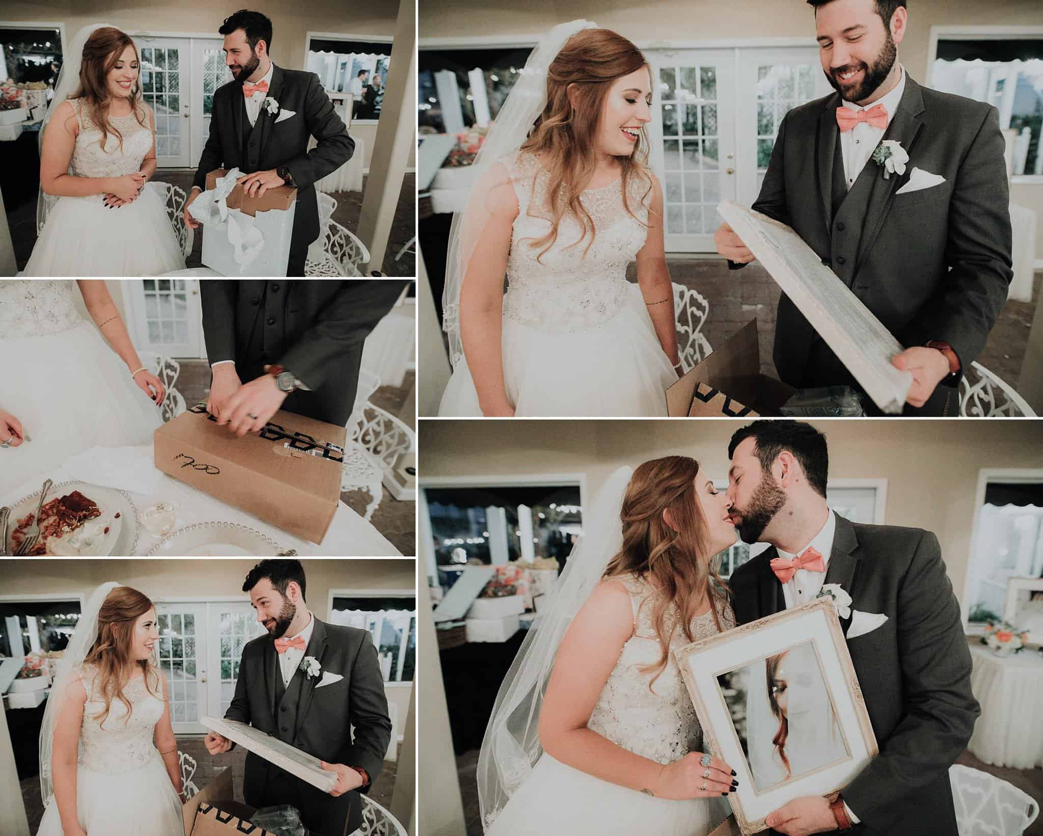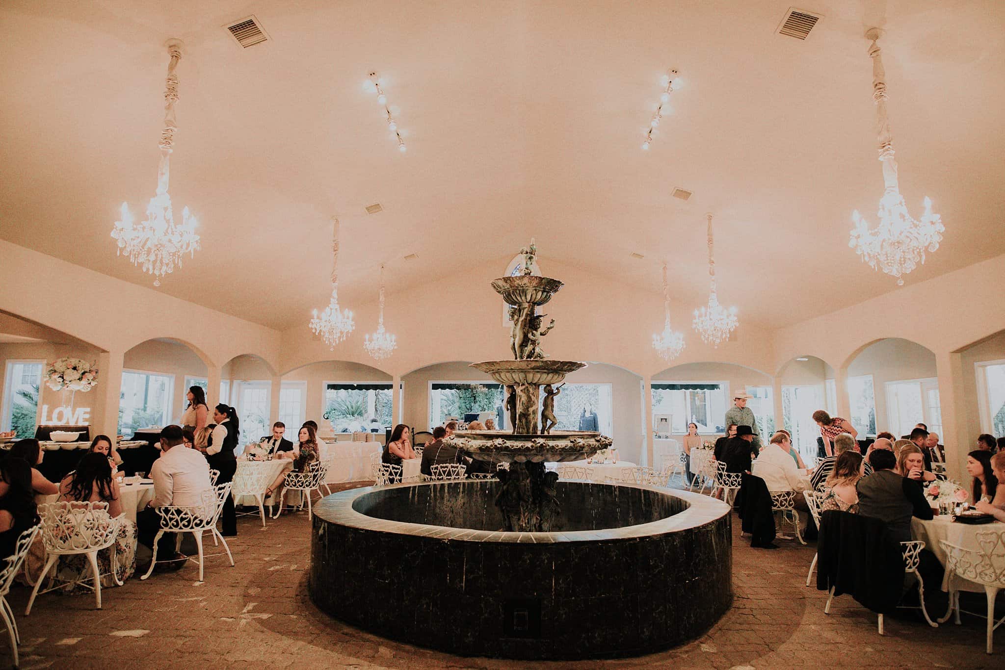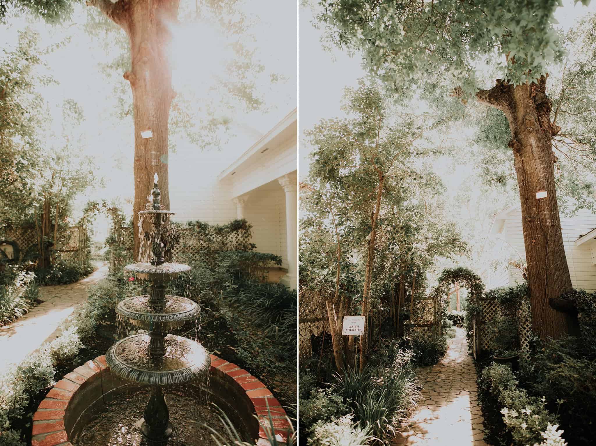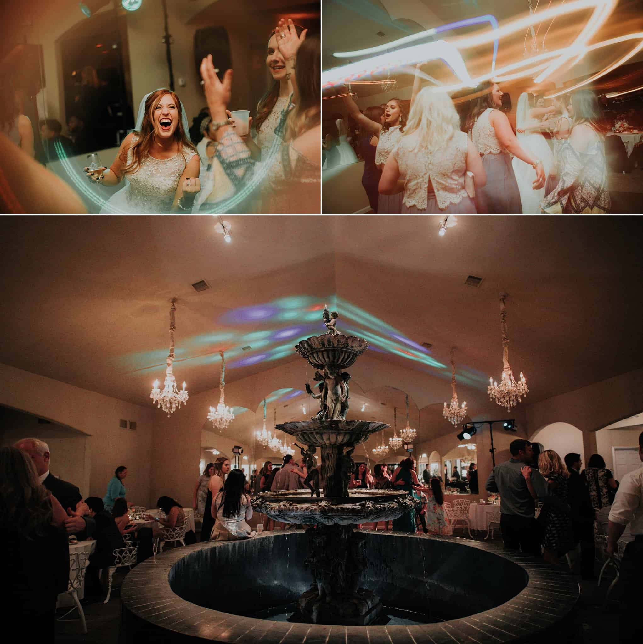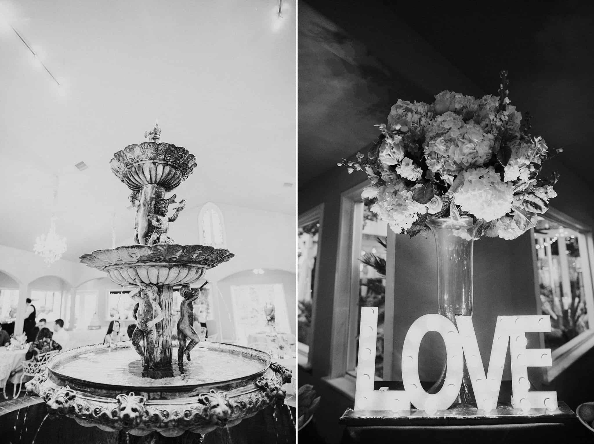 Caitlin got ready in her own bridal suite next to the ceremony chapel, while Austin had his own groom’s suite in the upstairs of a cute little building next door. They had total privacy with the entire venue and even though it is on a street in Conroe, it makes it feel like you’re in the middle of no where in your own Italian paradise. Around every corner is another whimsical detail. Caitlin gave Austin a watch before their ceremony, as well as a bridal portrait later during the reception. Austin gave her a beautiful box with sweet treasures inside. The ceremony was beautiful and afterwards we did couple formals as the sun set over the gardens. Friends and family celebrated throughout the night, being greeted by a polaroid guestbook, endless wine and snacks, a gorgeous dinner buffet that stretched out all throughout the side of the reception room. In the middle of the dance floor was a stunning water fountain that made it feel all the more Italian-esque.